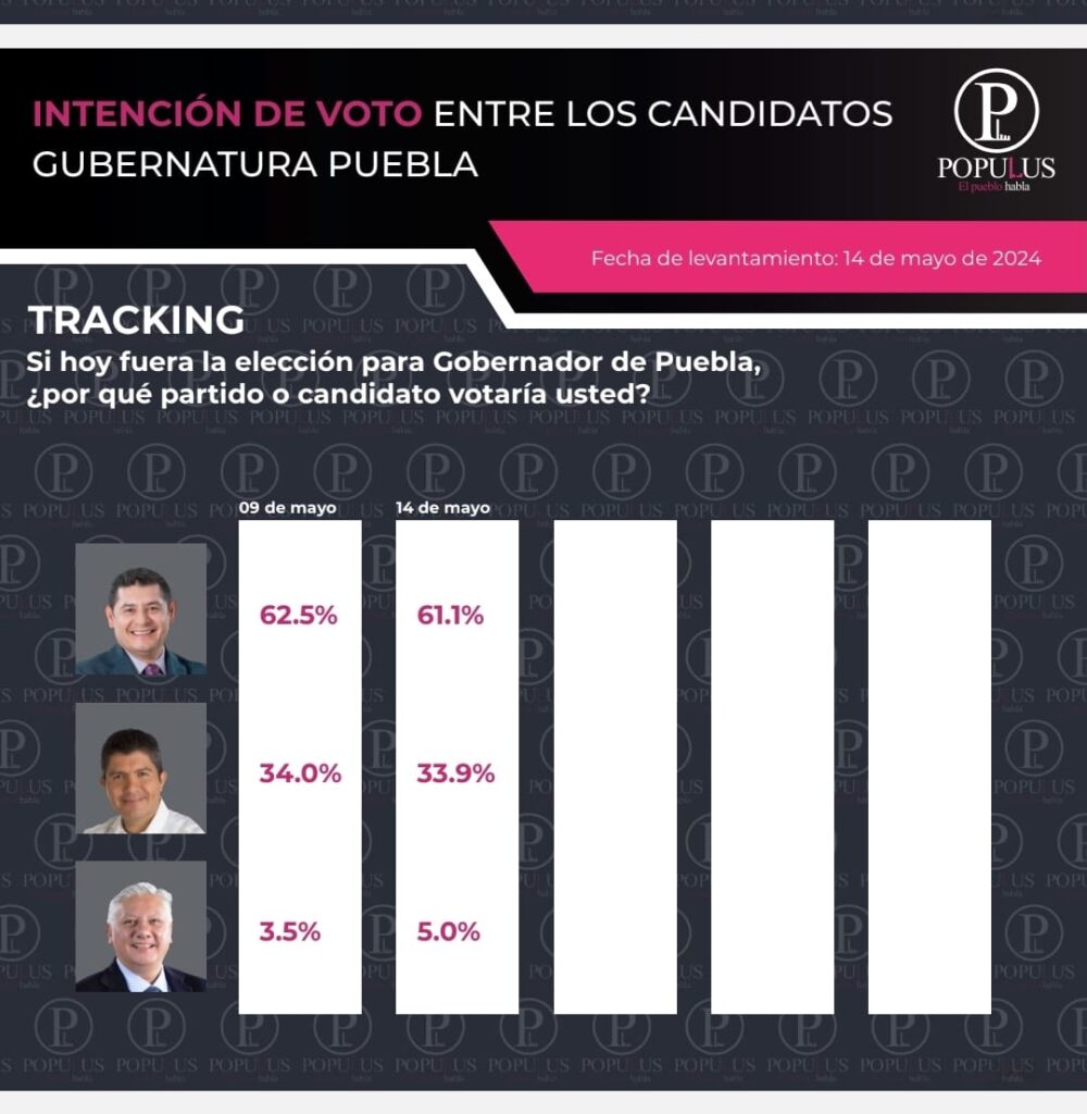 Las encuestas siguen dando como favorito a Alejandro Armenta, candidato a la gubernatura, comparado con sus dos adversarios. Según la empresa Populus, el candidato de la Megacoalición MORENA-PT-VERDE, FUERZA POR MEXICO-PANAL- tiene el 61.1 por ciento de la frecuencia electoral. La encuesta aplicada fue el pasado 14 de mayo.
