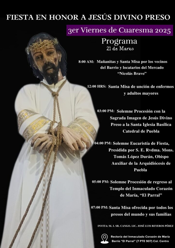 Ciudad de Puebla.- La comunidad del Templo de la Inmaculada Concepción de María – en el Barrio de El Parral, Centro Histórico- conmemorará la Fiesta a Jesús Divino Preso, el Tercer Viernes de Cuaresma, para lo cual habrá procesión, misas y unción de los enfermos, eventos que estarán encabezados por el arzobispo auxiliar Tomás López Durán.