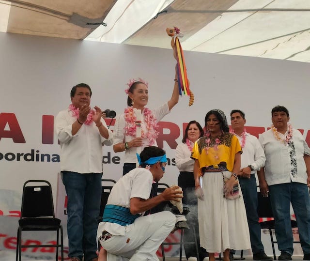 Posterior a sus palabras, representantes de Pueblos Originarios de Puebla entregaron a Claudia Sheinbaum su bastón de mando, no sólo en señal de considerarla uno de ellos, sino al verla como una líder que también los representa ante los mexicanos.