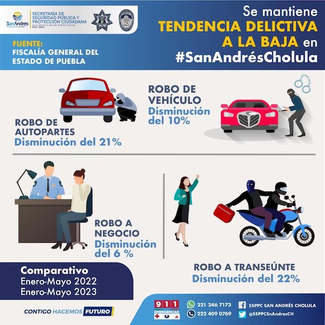 San Andrés Cholula, Pue.- Como resultado de la implementación de acciones en materia de prevención, la Secretaría de Seguridad Pública y Protección Ciudadana, informó que, durante los primeros cinco meses de 2023 en comparación con el mismo periodo del año anterior, el municipio registró una reducción en la incidencia delictiva en diversos delitos.