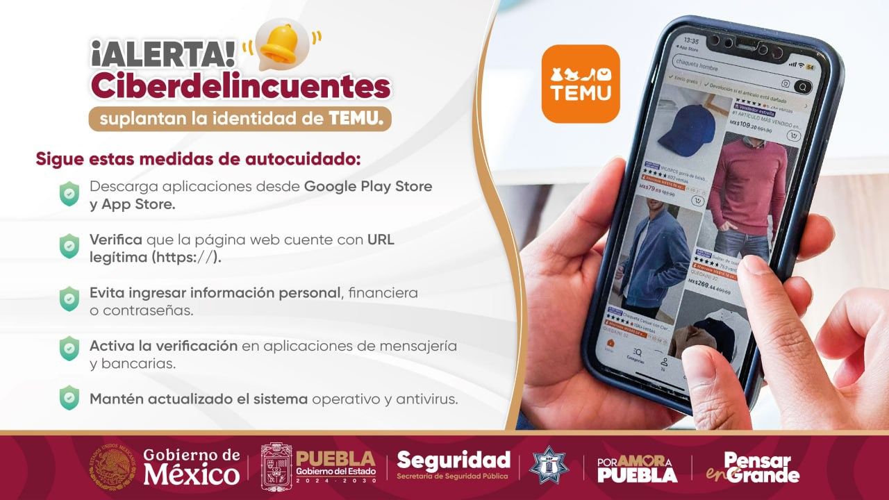 CIUDAD DE PUEBLA, Pue.- El Gobierno del Estado de Puebla, a través de la Secretaría de Seguridad Pública (SSP), hace un llamado a la población para redoblar medidas de autocuidado digital, debido a la suplantación de identidad de la plataforma de compras “TEMU”.