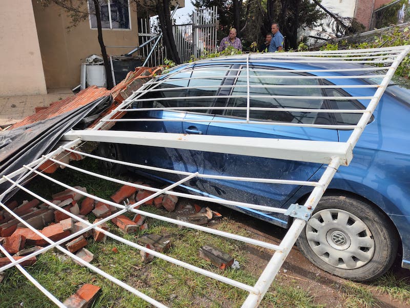 – En el costado derecho del conjunto, otro pino y un árbol de granado se desgajaron, lo que provocó el colapso de un tramo de la barda perimetral, cayendo sobre un vehículo estacionado. El propietario del automóvil, junto con otros vecinos, solicitó que no se realizaran maniobras de retiro hasta que sus aseguradoras concluyeran la revisión correspondiente.