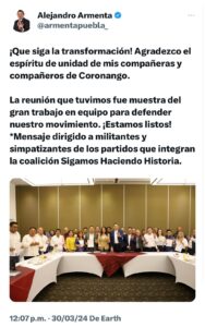 A unas horas de que inicie su campaña este 31 de Marzo, en el zócalo de Puebla, a la 01 horas ; Izúcar de Matamoros, a las 10 de la mañana; 4 de la tarde en la Unidad de Agua Santa; y 6 de la tarde en San Pedro Cholula, Alejandro Armenta, culminó con la enorme tarea de reunirse con todos los líderes representativos del Estado, a quienes agradeció su trabajo en favor de la 4ta, convocó realizar su mayor esfuerzo, para consolidar el segundo piso de la 4T y con la bandera del humanismo mexicano