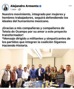 En todos los puntos cardinales del Estado, el candidato a la gubernatura Alejandro Armenta, se reunió con los liderazgos de Morena, para alentar a salir con toda la fuerza en la campaña electoral, visitando los municipios de Coronango y Tetela de Ocampo.