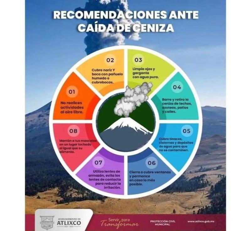 Derivado de la actividad que ha presentado el volcán Popocatépetl, el Ayuntamiento de Atlixco presidido por Ariadna Ayala a través de la Coordinación de Protección Civil, invita a las familias atlixquenses a seguir estas recomendaciones por la caída de ceniza en el municipio.