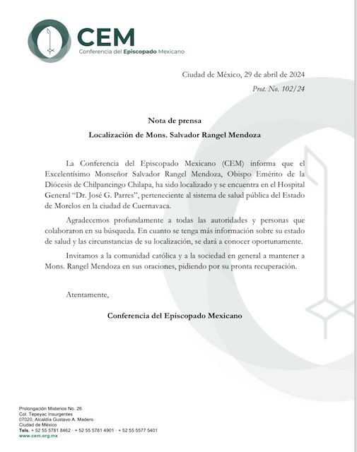 La Conferencia del Episcopado Mexicano -CEM- lo dio a conocer a través de un comunicado aunque no precisó el estado físico en que se encuentra.