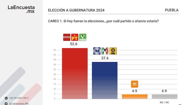 A través del levantamiento de información que realizó la empresa “La encuesta.mx» en el periodo comprendido del 29 de enero al 1 de febrero de 2024, en Puebla Morena y su abanderado Alejandro Armenta, mantienen una holgada ventaja sobre el candidato y alianza opositora.