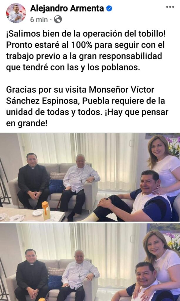 El virtual gobernador Alejandro Armenta, está en recuperación luego de la cirugía del tendón de Aquiles, a la cual fue sometido, y que le representó molestia física a final de su campaña y en la jornada electoral del pasado domingo.