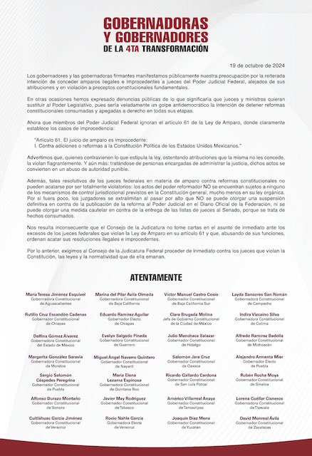 En una carta pública, el gobernador electo de Puebla, Alejandro Armenta Mier, al igual que sus homólogos del país, exigió al Consejo de la Judicatura Federal proceder de inmediato contra los jueces que violan la Constitución.