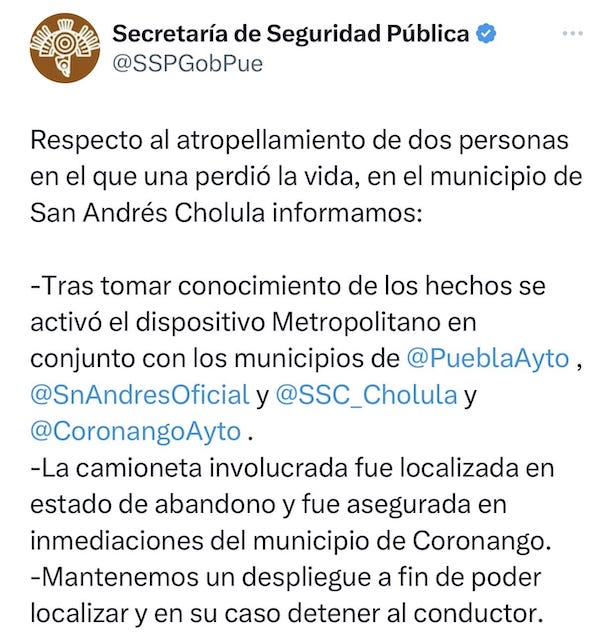 San Andrés Cholula, Pue.- En forma irresponsable un conductor de camioneta, se introdujo en la recta a Cholula, donde se desarrollaba la Ciclovía Dominical a cargo de la Secretaría de Movilidad y Transporte, atropellando a dos personas, una de ellas falleció.