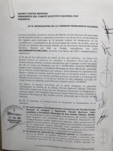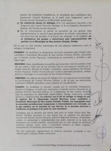San Andrés Cholula, Pue.- En forma unánime los 9 aspirantes a la candidatura por la alcaldía por el PAN, entregaron oficio dirigido al presidente nacional del blanquiazul, Marko Cortés, al que le piden reponer el proceso para elegir al abanderado, y no aceptar a Raymundo Cuautli Martínez, resultado de una acción viciada y totalmente imparcial.