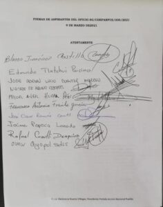 Los firmantes del oficio, son: Blanca Jiménez Castillo, Edmundo Tlatehui Percino, José Adrián Lucio Cuautli Moreno, Néstor de Aquino Coyopotl, Francisco Antonio Fraile García, José Oscar Ramírez, Jaime Popoca, Rafael Cuautli D`Aquino y Omar Coyopol Solis.
