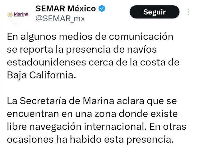 *La Secretaria de Marina, en comunicado dio a conocer que » los navíos se encuentran en zona marítima libre».