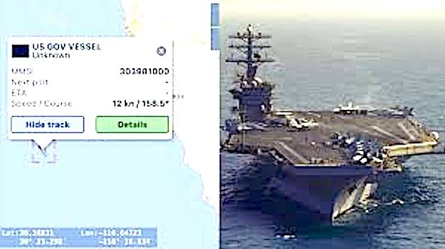 Un portaaviones de operaciones militares del gobierno estadounidense fue identificado por el portal Marine Traffic. El buque tiene una eslora de 155 metros y 20 metros de manga, y navega bajo la bandera de Estados Unidos.