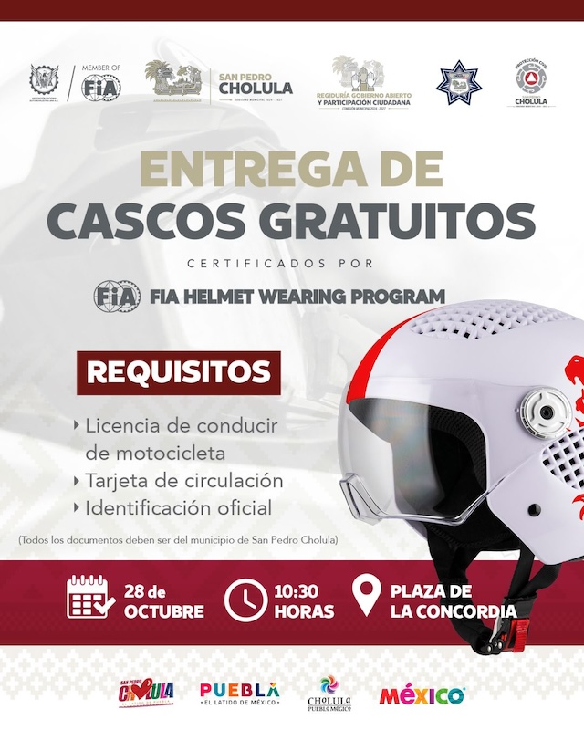 San Pedro Cholula, Pue.- Vives en Cholula y eres conductor de motocicleta. El Ayuntamiento te regala un casco profesional, certificado por FIA, solo debes mostrar los siguientes documentos: