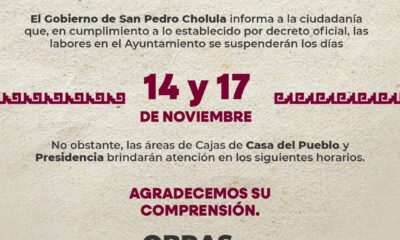 Diario Sin Secretos San Pedro Cholula, Pue.- Los días 14 y 17 de Noviembre no se realizarán trámites ni se atenderá de manera general en las...