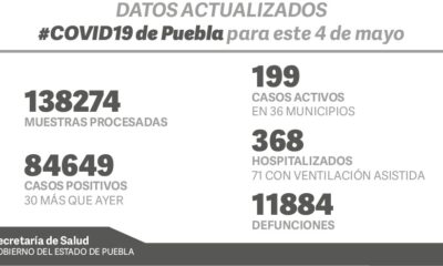Diariosinsecretos.com El titular de Salud del Gobierno de Puebla José Antonio Martínez , informó los datos Covid-19 en Puebla este 4 de mayo. 138274 muestras procesadas 84649 casos...