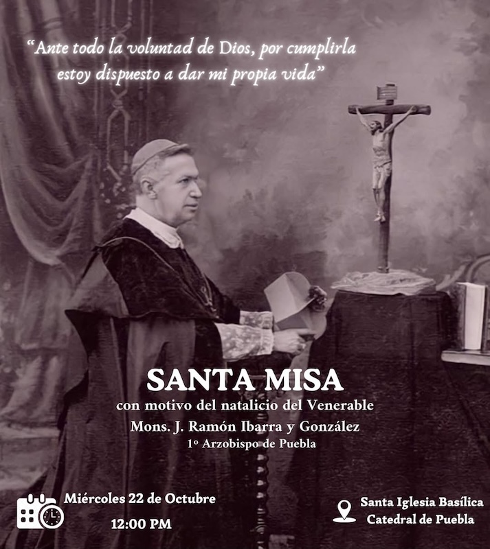 Ciudad de Puebla.- Monseñor Ramón Ibarra y González, declarado Venerable por el Papa Juan Pablo II, será recordado este miércoles 22 de Octubre en ocasión de la celebración de su natalicio, con una Misa en la Basílica de la Catedral de Puebla, a las 12: 00 p.m.