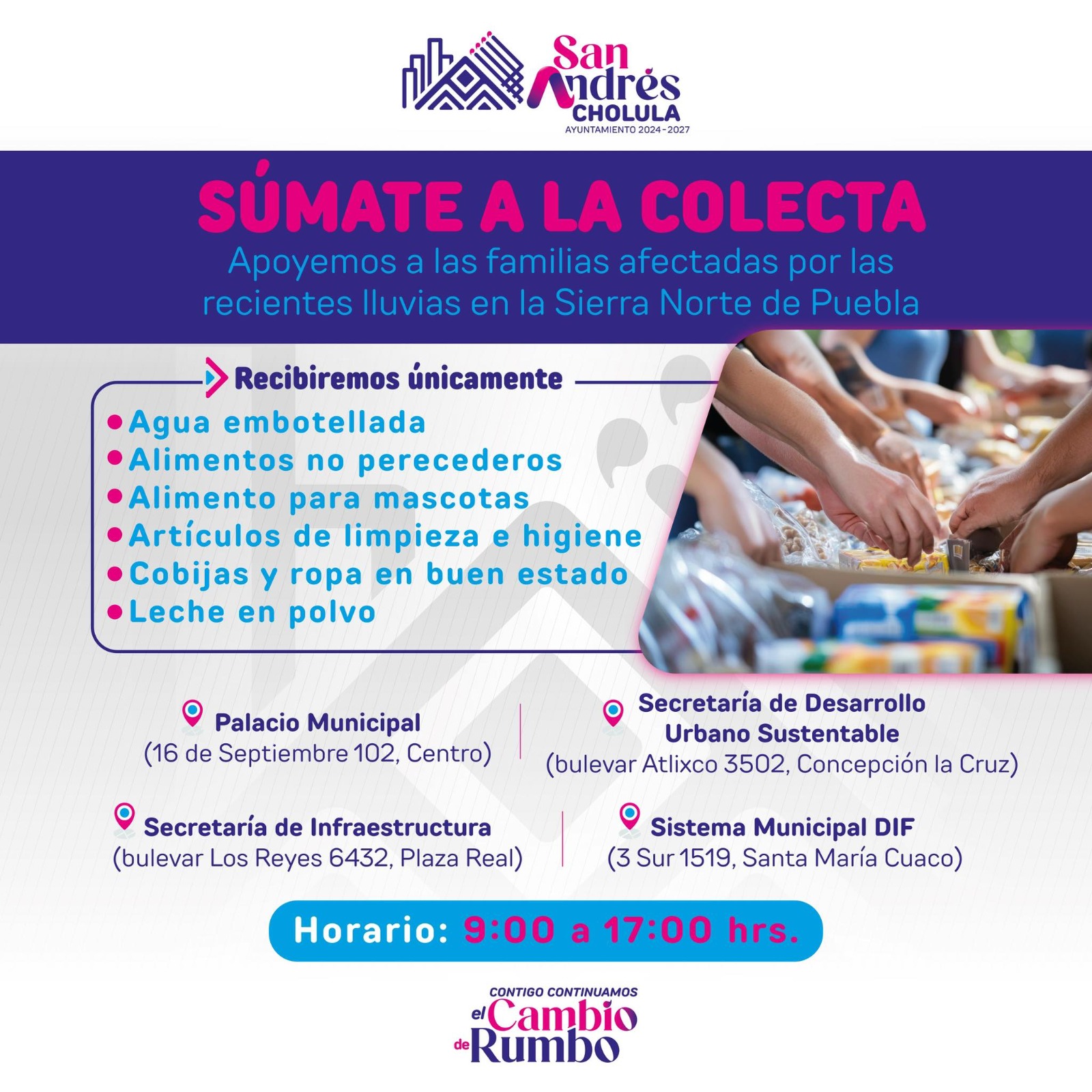 El Gobierno Municipal de San Andrés Cholula en solidaridad con los damnificados de la Sierra Norte, abrió un centro de acopio, donde se pueden llevar víveres.