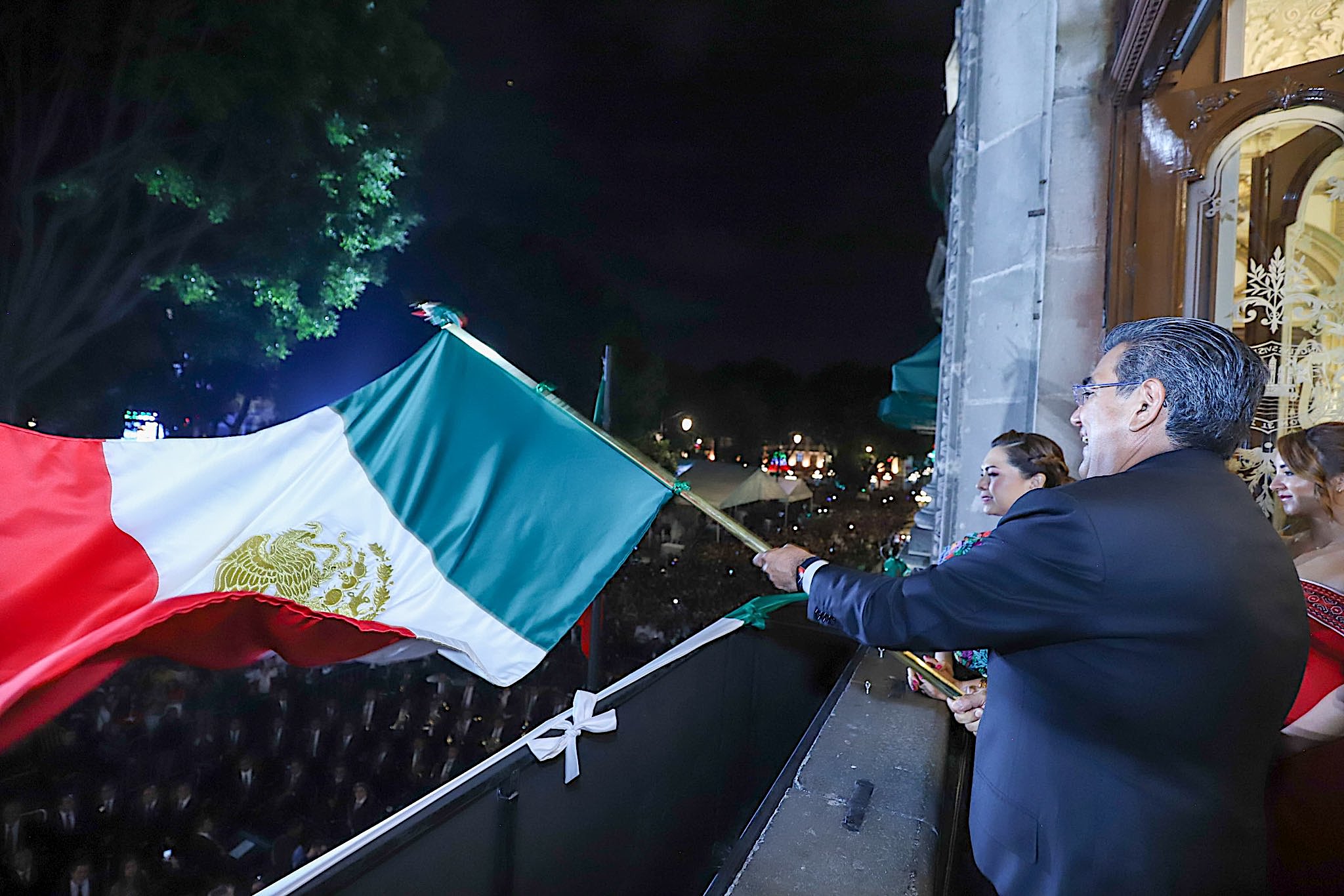 Ciudad de Puebla.- Ante miles de almas congregadas en el zócalo, el gobernador Sergio Salomón, acompañado de su esposa Gaby, desde el balcón del palacio municipal, dieron el Grito de Independencia, ante miles de almas congregadas en el zócalo, y majestuosa ondeó la Bandera Nacional y se entono el Himno Nacional Mexicano, y muda testiga la Catedral Metropolitana.