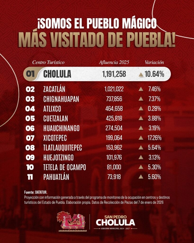 San Pedro Cholula, Pue.- Resultado de su riqueza cultural, gastronómica y de tradiciones, el Pueblo Mágico de Cholula se posicionó como el más visitado del estado de Puebla durante 2025, de acuerdo con cifras de DATATUR.