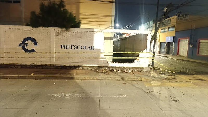 San Pedro Cholula, Pue. – Durante la madrugada de este domingo,- 3:30 horas- se registró aparatoso choque vehicular que arrojó como saldo un boquete a la barda perimetral del Centro Escolar Miguel Alemán.