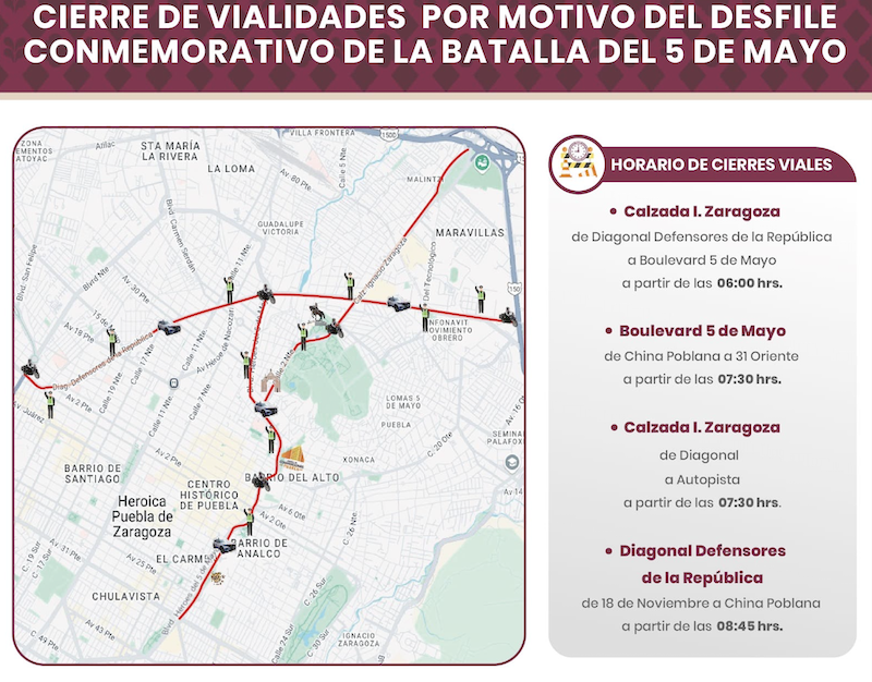 Habrá cierres viales en la Ciudad de Puebla de las 06:00 horas de este lunes 05 de mayo hasta las 16:30 horas del mismo día, derivado del Desfile Cívico-Militar, tome sus precauciones.