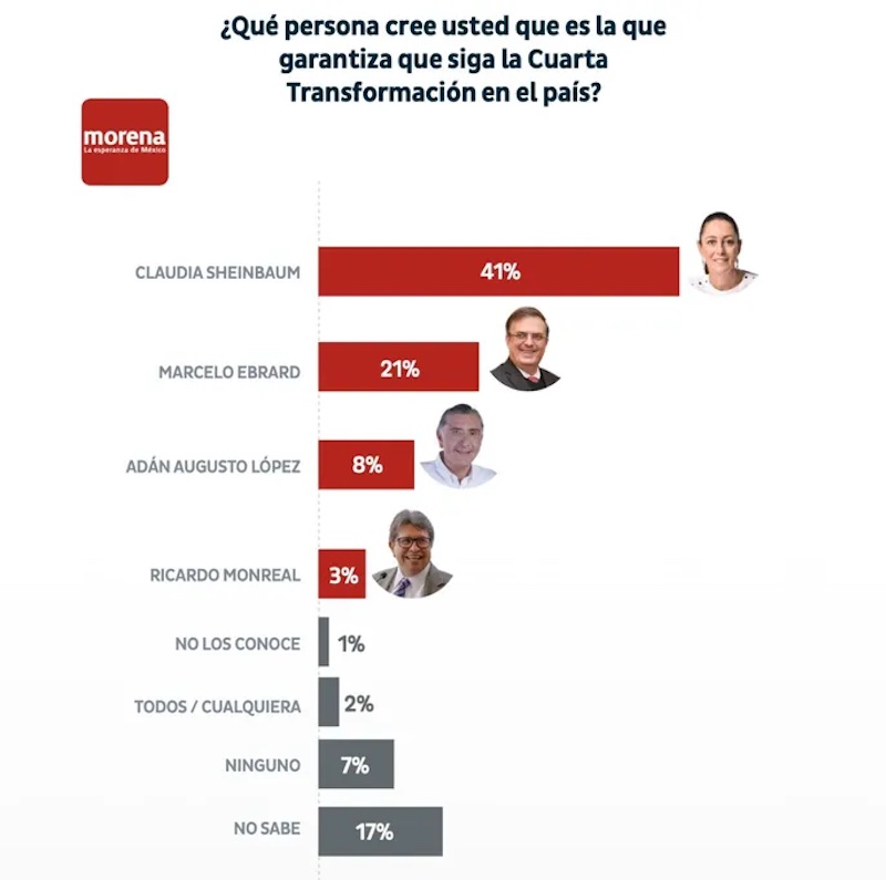 La jefa de gobierno de la Ciudad de México sobresale al interior de su partido como quien garantiza la continuidad del proyecto de la Cuarta Transformación (41%) y a quien los entrevistados consideran que cumplirá mejor con los principios de “No Mentir, No Robar y No Traicionar al Pueblo”, característicos del Movimiento de Regeneración Nacional (50%).
