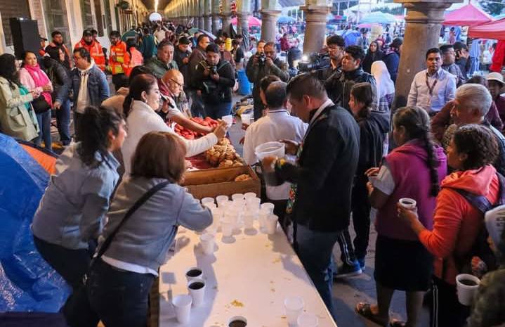 San Pedro Cholula, Pue.- En el inicio de las actividades del trueque, en la Plaza de la Concordia, el Gobierno Municipal de San Pedro Cholula inició la entrega de pan y café a los peregrinos que arriban para participar en una de las tradiciones más importantes de este municipio.