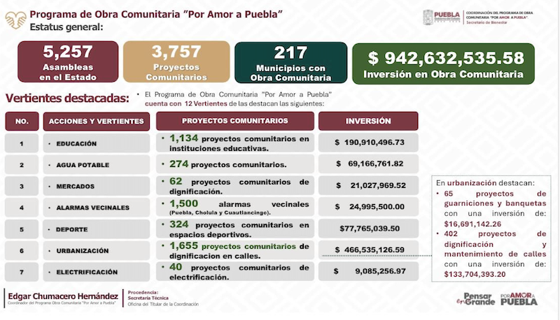 Agregó que mil 655 planes transforman la urbanización con mejores calles y caminos; 40 proyectos amplían la electrificación, al llevar luz a más hogares y comunidades. Asimismo, en la capital poblana se realizaron 785 asambleas y se destinó una inversión de 238 millones 538 mil pesos.
