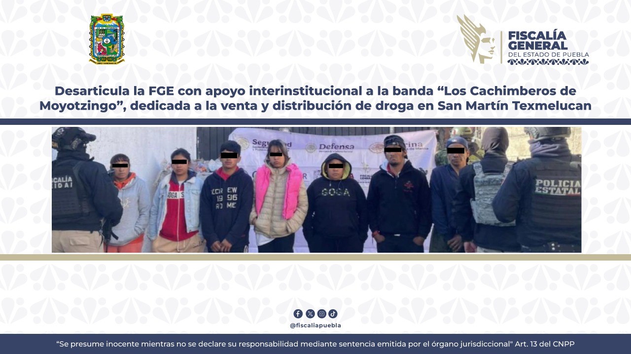 La Fiscalía General del Estado encabezó un operativo interinstitucional con apoyo de la Secretaría de la Defensa Nacional (DEFENSA) y la Secretaría de Seguridad Pública Estatal (SSPE), que dio como resultado la desarticulación de la banda de “Los Cachimberos de Moyotzingo”, integrada por siete personas presuntamente dedicadas desde hace varios años a la venta y distribución de estupefacientes en la región de San Martín Texmelucan.