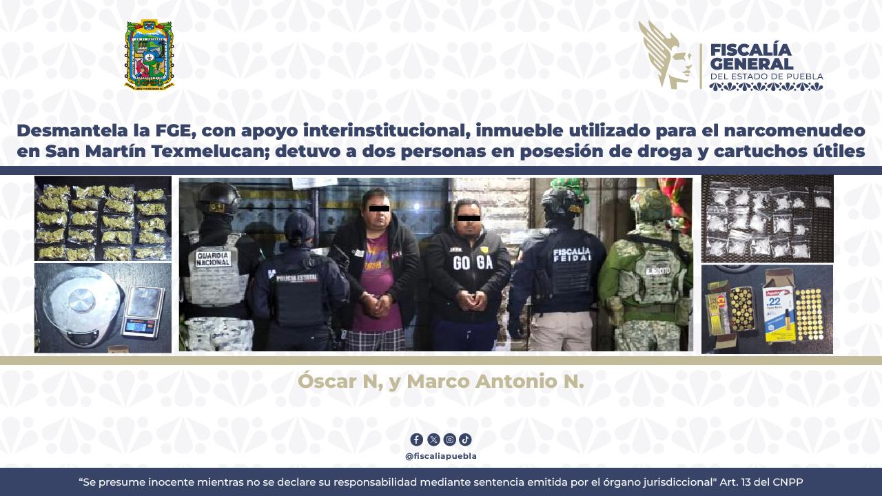 La Fiscalía General del Estado implementó, con apoyo interinstitucional, acciones operativas en San Martín Texmelucan, logrando desmantelar un inmueble utilizado para actividades de narcomenudeo; además, detuvo en el lugar a Óscar N. y Marco Antonio N., presuntamente en posesión de diversas dosis de estupefacientes y cartuchos útiles.