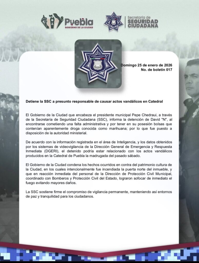 Ciudad de Puebla.- Autoridades civiles dieron a conocer de la detención de Daniel N. Presunto culpable del atentado de una de las puertas de la catedral de Perla, en la madrugada del pasado sábado, y que riñó en un acto de desagravio de l comunidad católica.