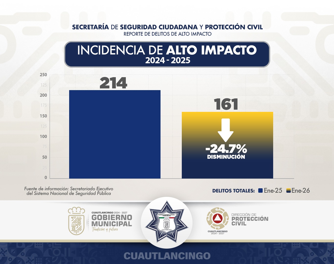 De acuerdo con el informe emitido por el Secretariado Ejecutivo del Sistema Nacional de Seguridad Pública, en enero de 2025 se registraron 214 delitos de alto impacto, mientras que en el primer mes de 2026 la cifra descendió a 161 casos, lo que representa una reducción de 53 delitos.