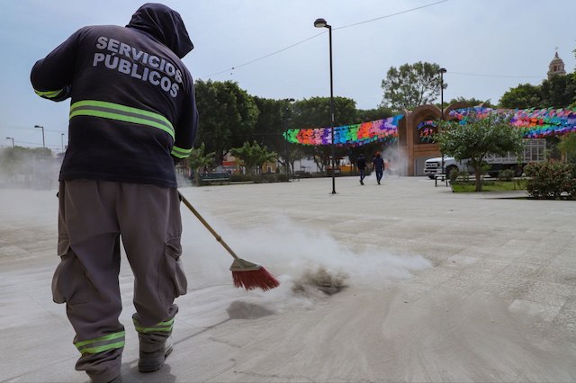 Las labores iniciaron en el zócalo en donde el personal municipal se dio a la tarea de barrer la ceniza volcánica de los andadores, acción que continuará a las calles de la cabeza municipal, y otros sectores del municipio.