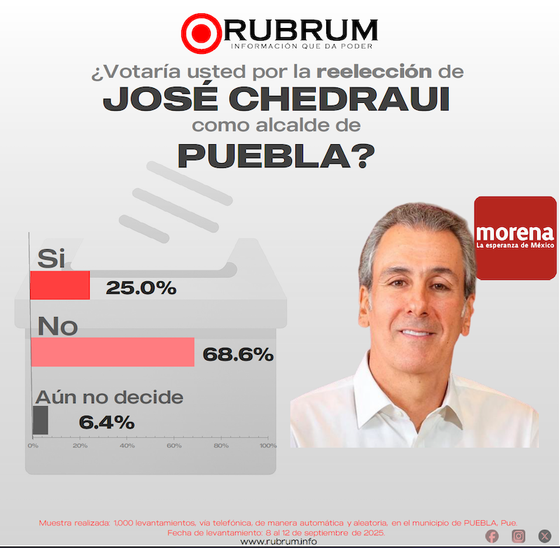 En la última evaluación de la empresa RUBRUM realizada en Septiembre respecto a la reelección del alcalde capitalino Pepe Chedraui (MORENA) hay un rechazo del 68.6 por ciento.
