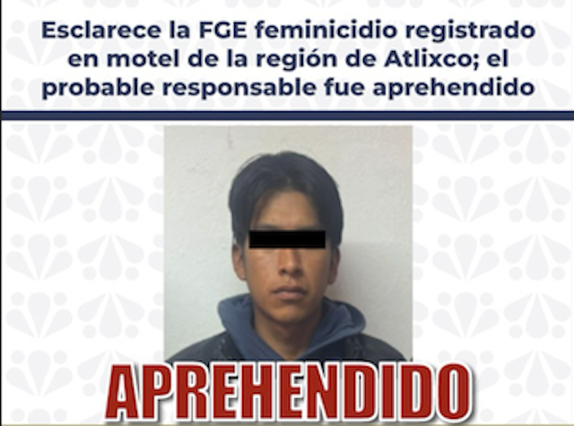 Ciudad de Puebla.- La Fiscalía General del Estado, informa que a través de labores de investigación, trabajo de campo y gabinete, se esclareció el feminicidio ocurrido en el motel “Paraíso”, ubicado en San Juan Tejaluca, Atlixco, Puebla. Asimismo, se logró la aprehensión de Alan N., de 23 años de edad, quien cuenta con orden de aprehensión como probable responsable del hecho.