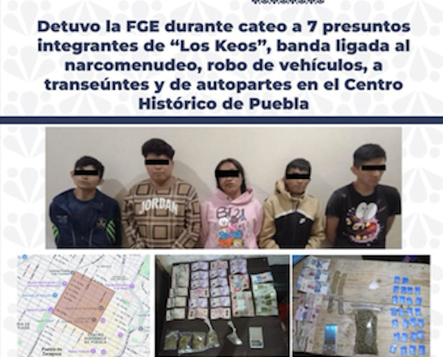 Ciudad de Puebla.- La Fiscalía General del Estado, informó que como resultado de labores de investigación, inteligencia y trabajo de campo, se ejecutó una orden de cateo en un inmueble ubicado en la colonia Centro, lo que derivó en la detención de siete presuntos integrantes de un grupo delictivo identificado como “Los Keos”, vinculado a actividades de narcomenudeo, robo de vehículos, robo a transeúntes y de autopartes, entre otros ilícitos.