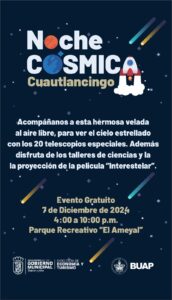 CUAUTLANCINGO, PUE. La Dirección de Economía y Turismo de Cuautlancingo invita a la ciudadanía a asistir a la “Noche cósmica,” éste sábado 07 de Diciembre en el Parque Recreativo “El Ameyal”, donde las familias podrán disfrutar de diversas actividades para chicos y grandes con un horario de 4:00 P.M. a 10:00 P.M.