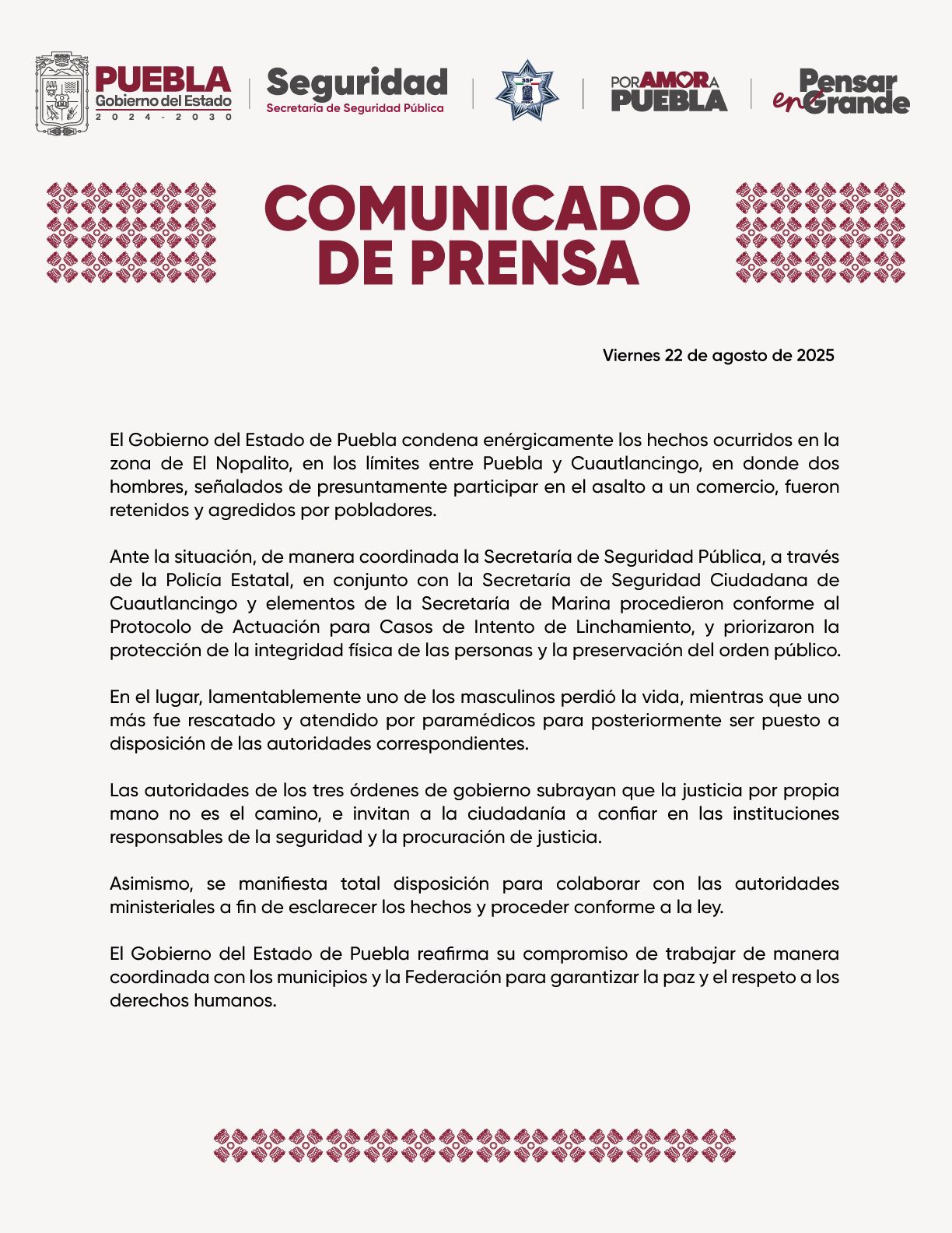 El Gobierno del Estado de Puebla condena enérgicamente los hechos ocurridos en la zona de El Nopalito, en los límites entre Puebla y Cuautlancingo, en donde dos hombres, señalados de presuntamente participar en el asalto a un comercio, fueron retenidos y agredidos por pobladores.