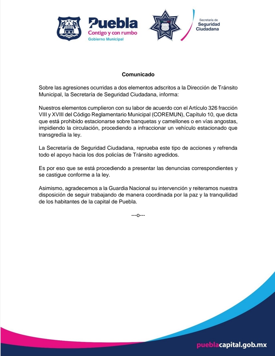 Ciudad de Puebla.- El Ayuntamiento capitalino reprobó la agresión por parte de un miembro de la Guardia Nacional contra 2 agentes de vialidad municipal por infraccionarlo por dejar estacionado en lugar prohibido.
