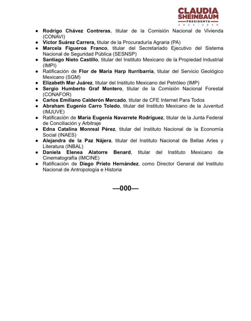 Ciudad de México.- En la víspera a su toma de protesta como presidenta constitucional, Claudia Sheinbaum, dio a conocer una lista de 35 nombramientos para su gabinete, en la cual incluye las ratificaciones de funcionarios que colaboran con el hoy expresidenta Andrés Manuel López Obrador.