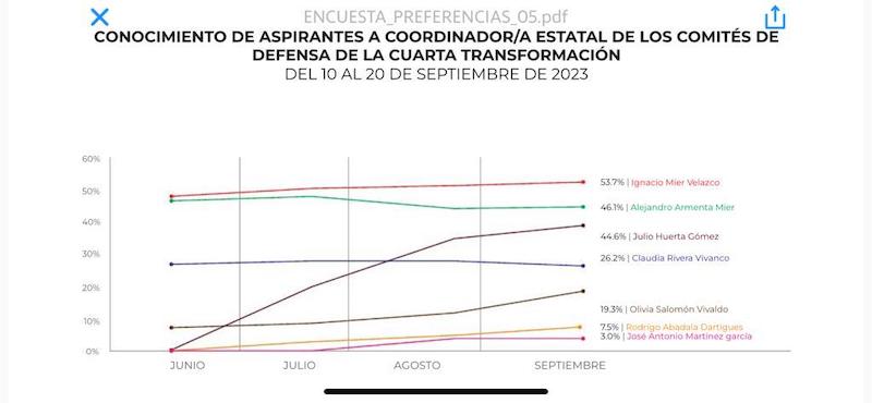De acuerdo con los resultados presentados por el Instituto de Estudios Prospectivos para el Desarrollo Social S.C. (iSocial), respecto a un estudio demoscópico de las preferencias de la ciudadanía sobre los diferentes aspirantes a encabezar la coordinación estatal de los Comités de Defensa de la Cuarta Transformación, Julio Huerta es quien más ha crecido tanto en conocimiento como en preferencia.