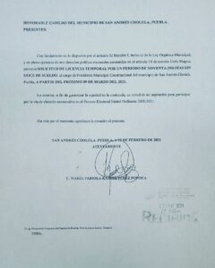 San Andrés Cholula, Pue.- Karina Pérez Popoca, solicitó al Cabildo licencia para ausentarse al cargo de alcaldesa a partir del próximo 9 de marzo, en busca de la candidatura municipal, y someterse a la medición mediante encuesta de MORENA.