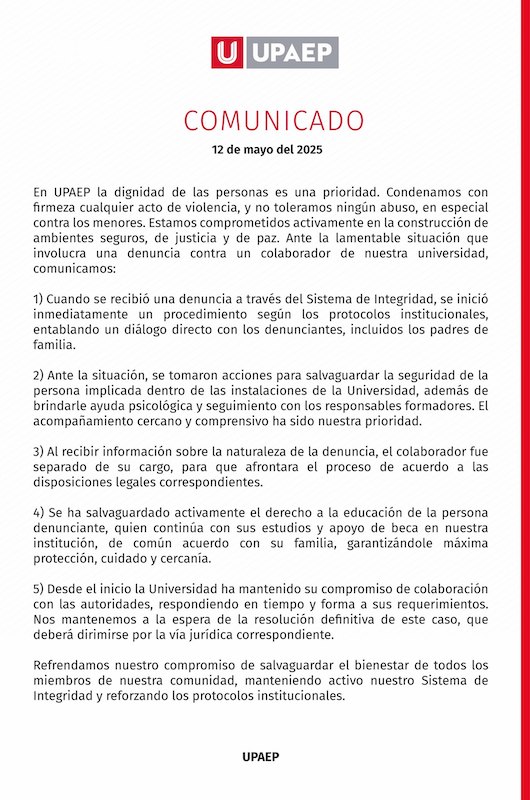 Ante los hechos, la UPAEP emitió comunicado en el cual manifiesta su indignación y condenó el hecho, señalando “el compromiso de construir ambientes seguros, de justicia y de paz”.