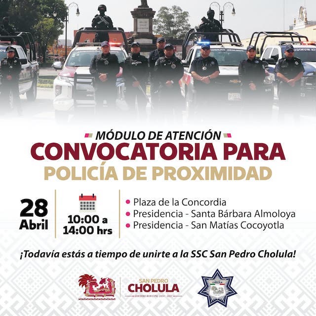 San Pedro Cholula, Puebla.- La Secretaría de Seguridad Ciudadana lanzó convocatoria para que hombres y mujeres interesados en formar parte de la corporación como policías de proximidad, acudir a inscribirse. El objetivo: fortalecer el estado de fuerza y seguir garantizando la seguridad de las familias cholultecas.