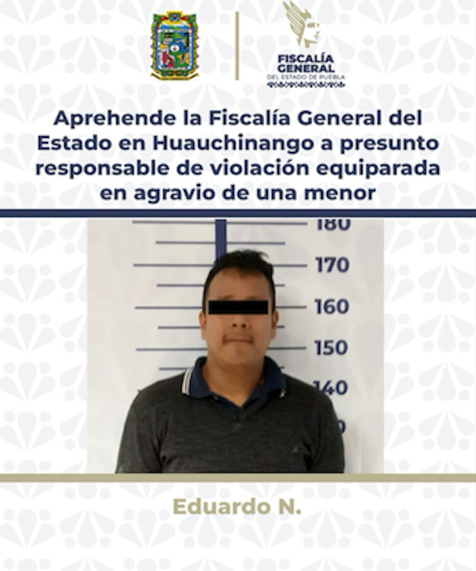 Huauchinango, Pue.- La Fiscalía General del Estado informa que fue aprehendido en el municipio de Huauchinango, Eduardo N., de 32 años de edad, originario de Pahuatlán, como presunto responsable del delito de violación equiparada en agravio de una menor de edad.