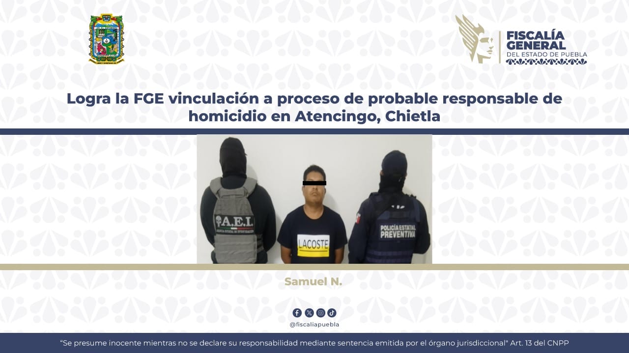 La Fiscalía General del Estado de Puebla obtuvo la vinculación a proceso de Samuel N., señalado como probable responsable del delito de homicidio calificado en agravio de un hombre, en la localidad de Atencingo, perteneciente a Chietla, Puebla.