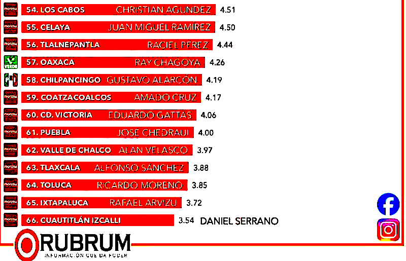 El último lugar fue el presidente municipal de Cuautitlán Izcalli, Danie Serrano, con 3.54 por ciento.