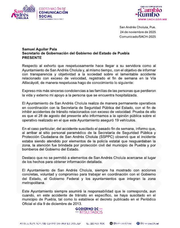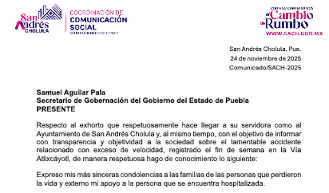 San Andrés Cholula, Pue.- En una carta pública dirigida al Secretario de Gobernación Estatal, Samuel Aguilar Pala, la alcaldesa de San Andrés Cholula, Lupita Cuautle Torres, fijó su postura con relación al lamentable hecho automovilístico acontecidos en la Vía Atlixcáyotl, el pasado fin de semana, y reitera su disposición a seguir con los operativos viales entre su gobierno y la Secretaria de Seguridad Pública estatal.